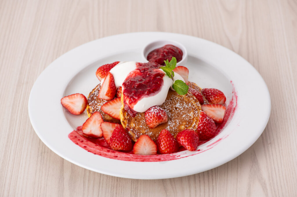 「ベリーストロベリーパンケーキ」は、ふわふわのバターミルクパンケーキに、フレッシュストロベリーと果実感たっぷりの自家製ストロベリーソースを贅沢にトッピングした期間限定スペシャルメニュー。軽やかなギリシャヨーグルトとともにお召し上がりください。苺ファンにはたまらない、華やかな一皿に仕上げました。
