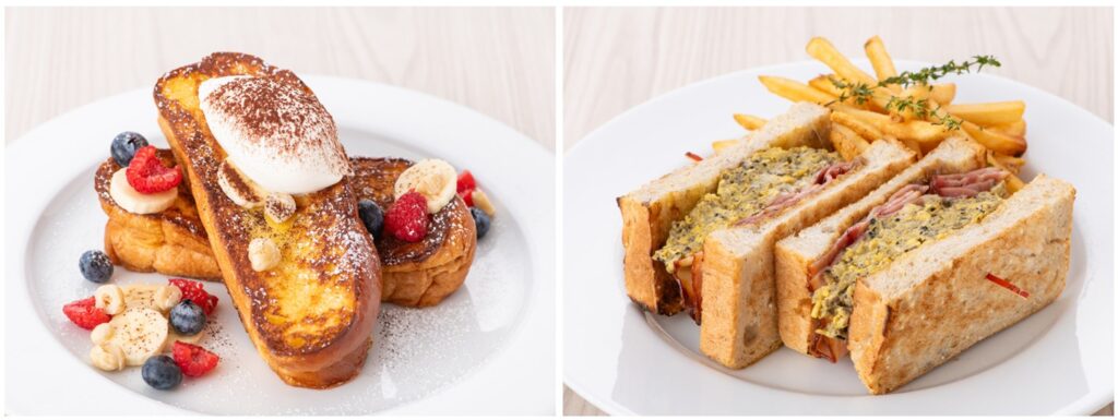また、セイボリーアイテムとして、ヒマラヤトリュフ、ホワイトチェダーと共にふわふわに仕上げたスクランブルエッグと、香ばしいベイクドベーコン、甘さを引き出し丁寧にソテーしたオニオンをグレインブレッドでサンドした「トリュフ&チーズスクランブルエッグとベイクドベーコンのサンドウィッチ」をご用意しました。たっぷりのポテトとともに、豪快に頬張ってお召し上がりください。