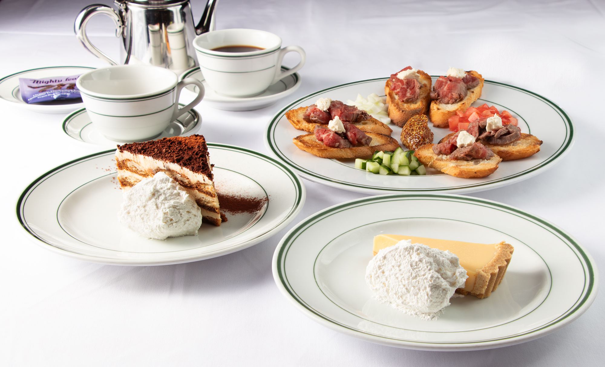 セイボリーアイテムからは、カリッと焼いた小さなパンの上に、さまざまな具材をのせたクロスティーニを。トッピングはビーフ、シーフードからお選びいただけます。そして、6種(アップルストゥルーデル/ニューヨークスタイルチーズケーキ/チョコレートムースケーキ/ティラミス/キーライムパイ/ピーカンパイ)もの自家製スイーツからお好きな一品をどうぞ。お飲み物はコーヒー、または紅茶をお付けします。