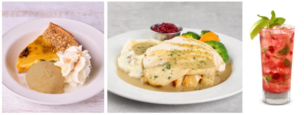今年のハードロックカフェ・サンクスギビングスペシャルフードは、じっくりローストしたターキーのホワイトミートをグレイビーソースと共に味わう「サンクスギビング ディナー」と、カスタードクリームとパンプキンピューレで作ったタルトをブリュレ風に仕上げ、マロングラッセジェラートを添えた「サンクスギビング パンプキンタルト」の2種。いずれもサンクスギビングを祝うトラディショナルな料理です。加えて、ラムをベースにこれら料理と相性抜群の甘酸っぱいクランベリーで仕上げたカクテル「クランベリーモヒート」を用意しました。
