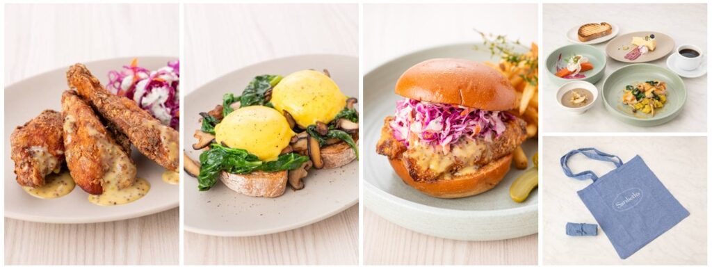 オープンに際し、これを記念したサラベス・ロゴ入り リサイクルコットンエコバッグ(非売品)を制作、対象コースメニューのご注文のお客様にプレゼント(※限定数、なくなり次第終了)します。また、ニューヨークの最新食トレンドを体現した店舗限定メニューをご用意し、お客様をお迎えします。